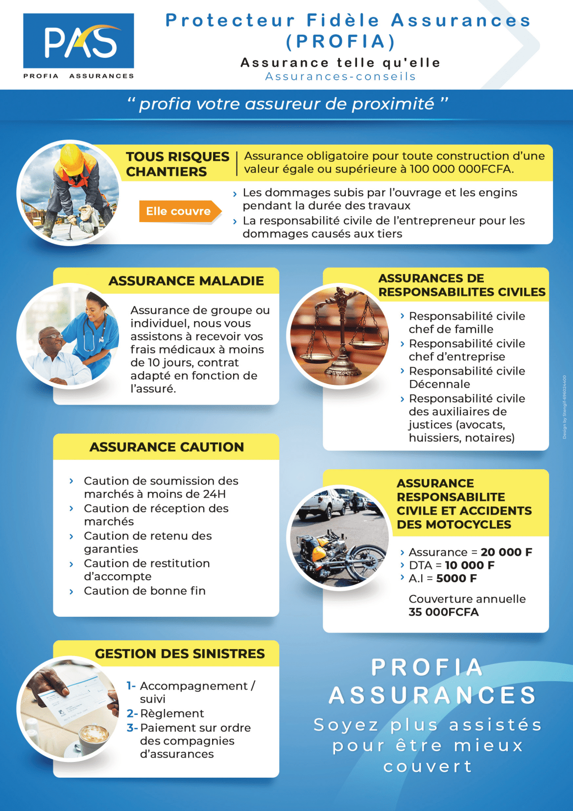 Protecteur Fidèle Assurances (PROFIA) est une société de courtage d'assurances basée dans la ville de Yaoundé. PROFIA est spécialisé dans : L'évaluation des risques assurables, l'intermédiation, la vente des produits d'assurances, l'assistance en cas de sinistres, la formation en assurances... Son équipe est composée des Professionnels aux métiers d'Assurances.