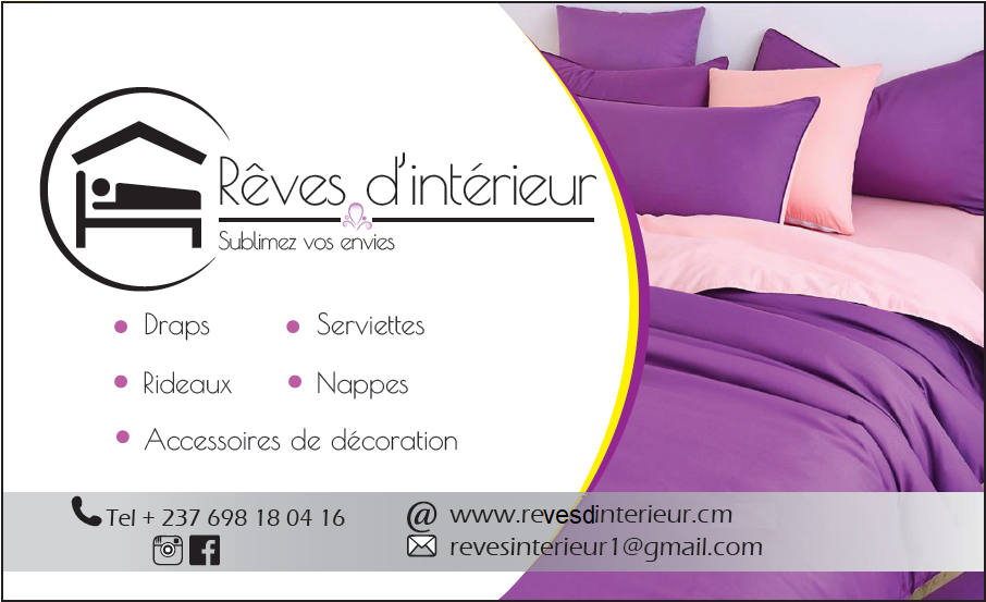 Rêve d'intérieur est un magasin spécialisé dans la vente des accessoires haut de gamme pour literie et maison. Vous y trouverez des draps, des rideaux, des serviettes, des nappes et des accessoires de décoration. Rêve d'intérieur est situé à Douala Bonamoussadi, SCI Saligny derrière Mahima juste avant Carrefour market.