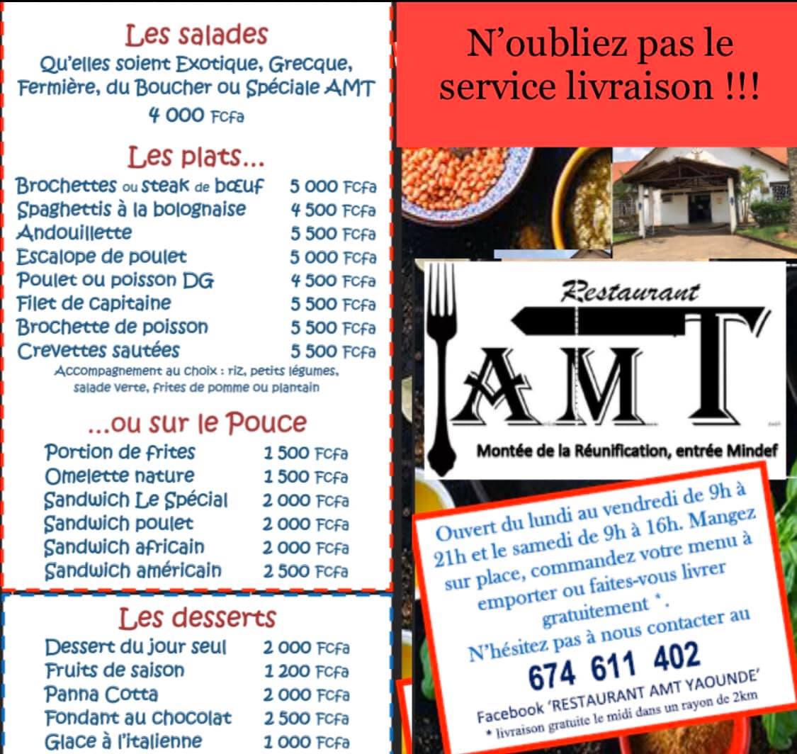 Le Restaurant AMT est situé en plein cœur de la ville de Yaoundé. Venez déguster plat et sandwich proposés par le Chef dans un cadre de détente en plein centre de Yaoundé. Le service livraison est assuré gratuitement dans un rayon de 2km.