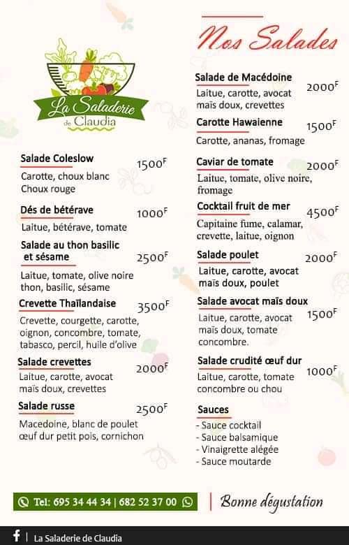 Saladerie 2 Claudia est bar à salade situé au quartier Bali. L'explosion des papilles est toujours au rendez-vous chez nous. La saladerie de Claudia est le numéro en matière de salades. Nous disposons de tous types selon votre convenance. Nos salades sont légères, soft, mais curieusement elles vous rassasient. Pour les accompagner nous vous proposons aussi divers plats chauds.