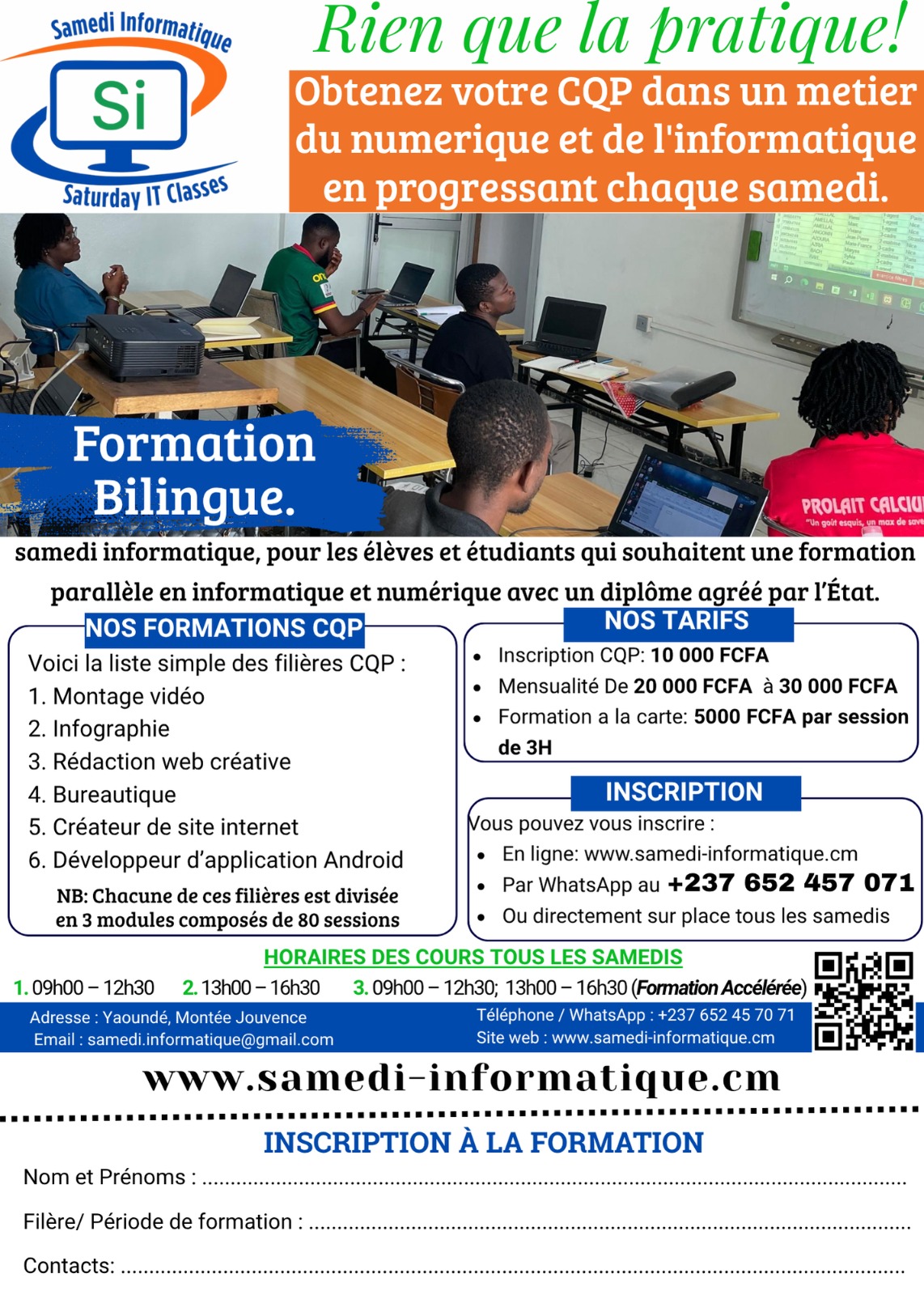 Samedi Informatique est une initiative camerounaise dédiée à la formation numérique de tous. Nous proposons des cours en informatique de base, bureautique, programmation, infographie, design graphique, et marketing digital chaque samedi. Que vous soyez étudiant, professionnel ou passionné, notre objectif est de vous rendre autonome dans le monde numérique. Nos formations s'adaptent à tous les niveaux et sont dispensées en présentielle dans la ville de Yaoundé. Avec un accès à des outils modernes, Samedi Informatique accompagne la transformation digitale au Cameroun et en Afrique francophone.