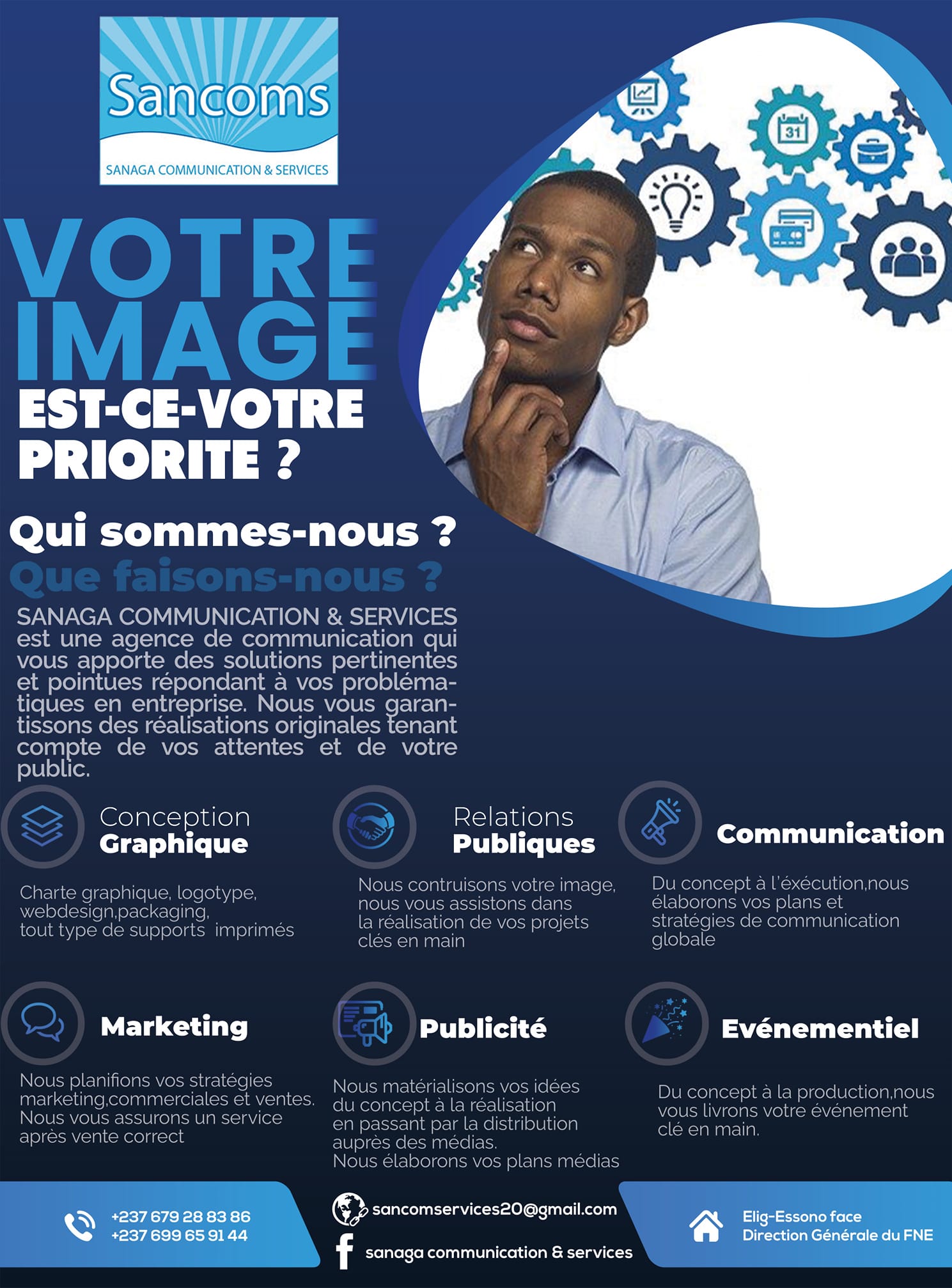 Créée en 2015, Sanaga Communication and Services (SANCOMS) est une agence de communication située à Yaoundé quartier Elig-Essono face Direction Générale FNE (SANCOMS) qui se veut différente par son approche de la communication et du marketing. SANCOMS guide ses clients sur le fond et la forme de leur démarche en leurs proposant de nouvelles voies pour affirmer l’identité de leurs actions au quotidien. Les principales valeurs de SANCOMS sont la particularité, la collaboration, la priorité importants piliers de la relation de proximité entrenue avec ses partenaires.