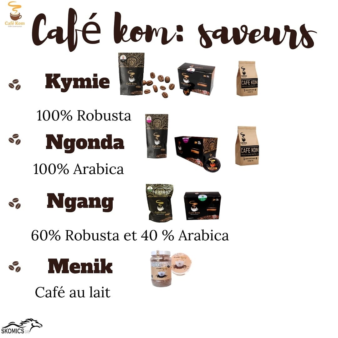Skomics sarl est une entreprise camerounaise qui produit et commercialise du café en capsule. Café Kom est la marque de café de l’entreprise Skomics sarl créée en Janvier 2018 et basée dans la ville de Douala au Cameroun. Elle produit des cafés sous forme de capsules et qui sont compatibles avec des machines à café nespresso. Entre KYMIE qui se veut 100% robusta ou encore NGONDA 100% arabica, vous trouverez diverses variétés de café accessibles à toutes les bourses.