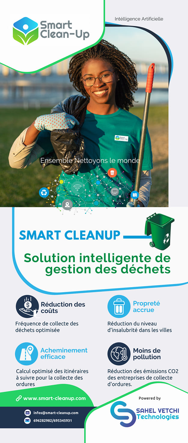 Smart Clean Up est une organisation qui œuvre pour la protection de notre environnement en luttant contre la pollution par déchets plastique qui est la cause de beaucoup de problèmes dans le monde et particulièrement sur le continent Africain. Smart Clean Up permet de réduire la quantité de déchets plastiques polluant notre environnement grâce au recyclage et rendre nos villes plus propres grâce à un système intelligent de gestion des déchets.