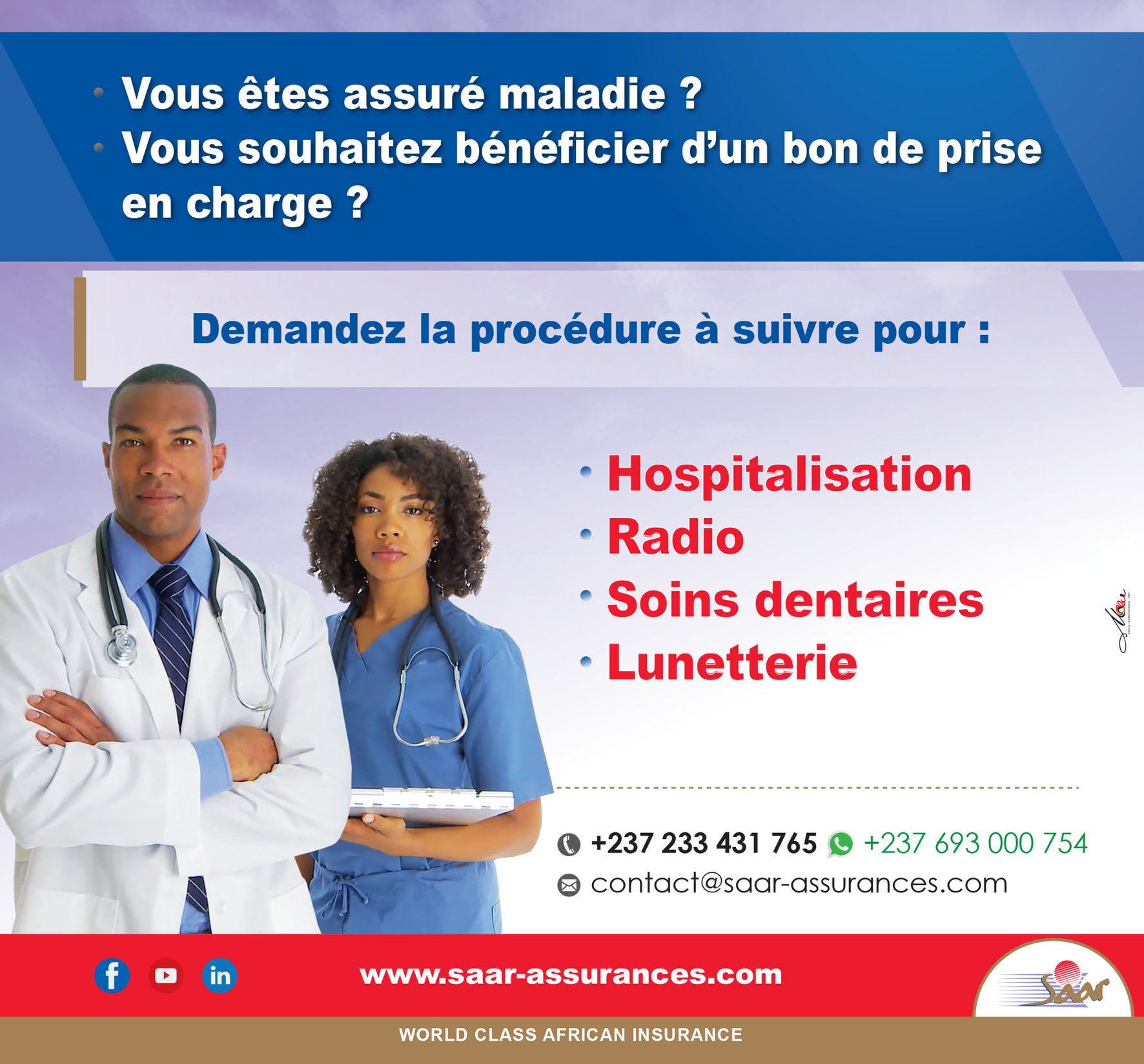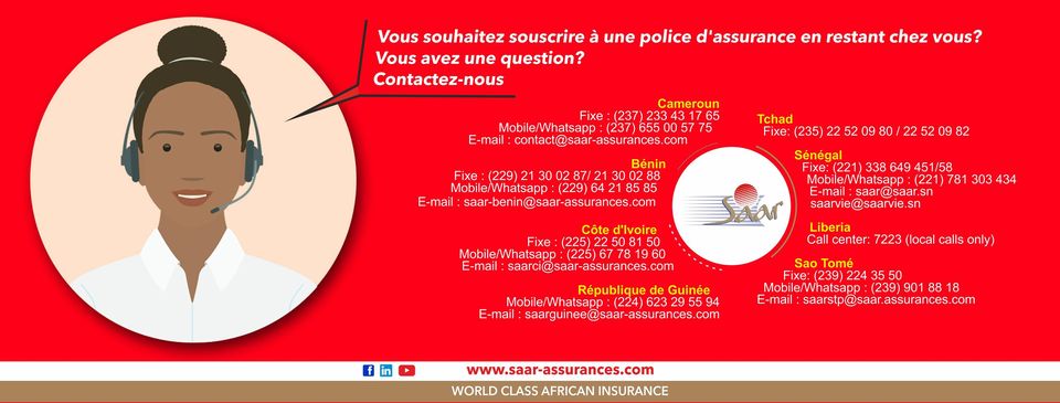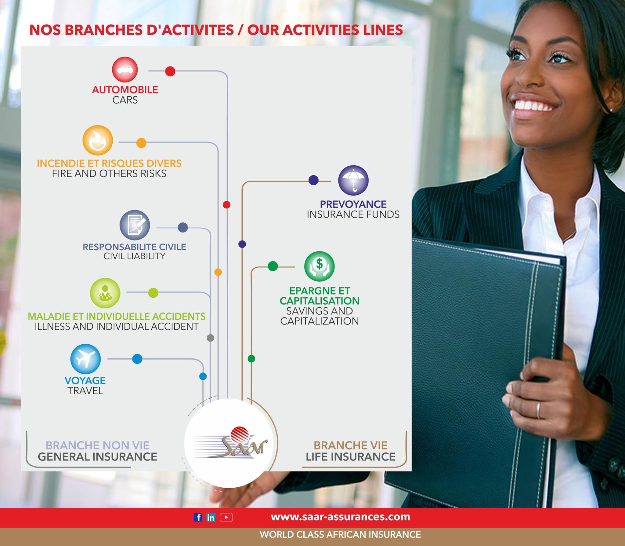 La Société africaine d’assurances et de réassurances (SAAR) a été créée au Cameroun le 27 novembre 1990, avec un capital social de 400 000 000 FCFA. Entreprise dynamique et visionnaire, elle fait partie aujourd’hui des leaders dans la zone CIMA, grâce à un Réseau couvrant neuf pays du continent africain : Benin, Cameroun, Cote d’Ivoire, Guinée Equatoriale, Liberia, République de Guinée, Sao Tome et Principe, Sénégal, Tchad. La SAAR offre des produits dans les secteurs de l’assurance vie, l’assurance non-vie et de l’immobilier. Dans la Branche non-vie, les garanties couvrent l’Automobile, la Santé, les Transports, la Responsabilité Civile, et les Risques Divers. Dans la Branche vie, nous proposons des produits en Epargne et en Prévoyance. La vision de l’entreprise« World Class African Insurance » se résume en trois points : Assurer un service aux standards internationaux de l’assurance ; Fournir des solutions adaptées aux besoins de nos clients ; Œuvrer efficacement au développement du continent africain.