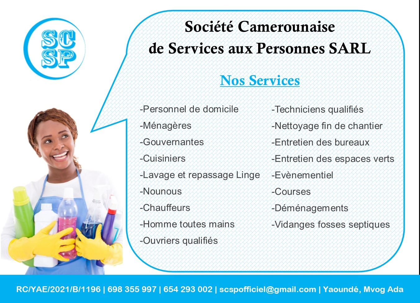 La Société Camerounaise de Services aux Personnes (SCSP) offre des prestations diverses aux particuliers pour les tâches à domicile : ménage, entretien, jardinage, garde des enfants en bas âge, cuisine, courses, homme toute mains, et bien d'autres. Nous intervenons partout au Cameroun à des prix défiants toutes concurrences.