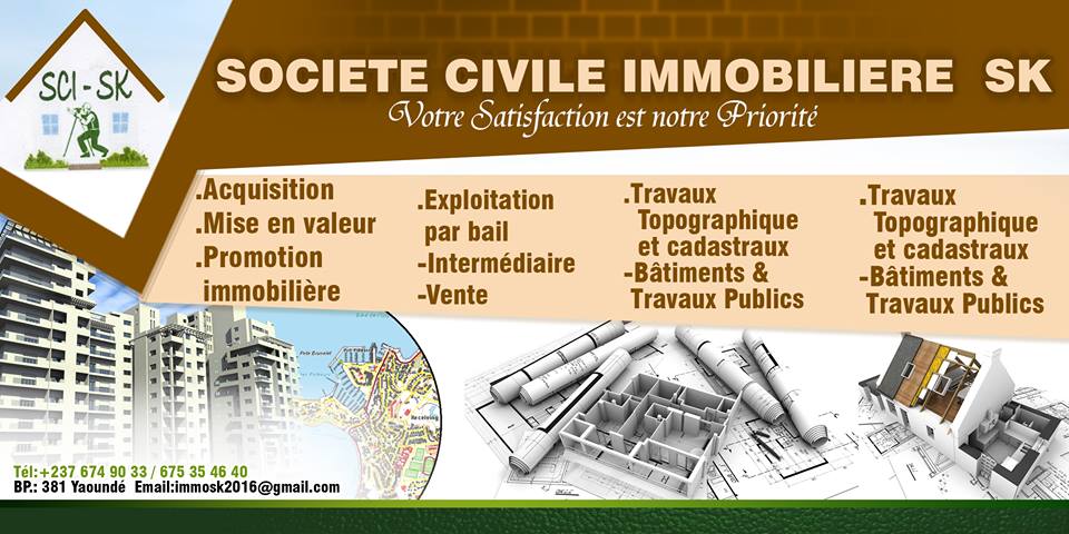 La Société Civile Immobilière SK (SCI SK) est une société de prestations de services immobiliers qui pour accompagne dans la réalisation de tous vos projets immobiliers. SCI SK vous propose ses services en : Conseil Immobilier, gestion immobilière et patrimoine, location de terrains, vente de terrains, suivi d'immatriculation foncière et lotissement et prise en charge des litiges fonciers, topographie, BTP, étude de projets de génie civil, conception des plans techniques et architecturaux 2D et 3D, réalisation des bâtiments, réalisation des ouvrages d'art, service lié au cadastre, suivi de l'établissement du permis de bâtir. Nous sommes basé au Cameroun dans la ville de Yaoundé.