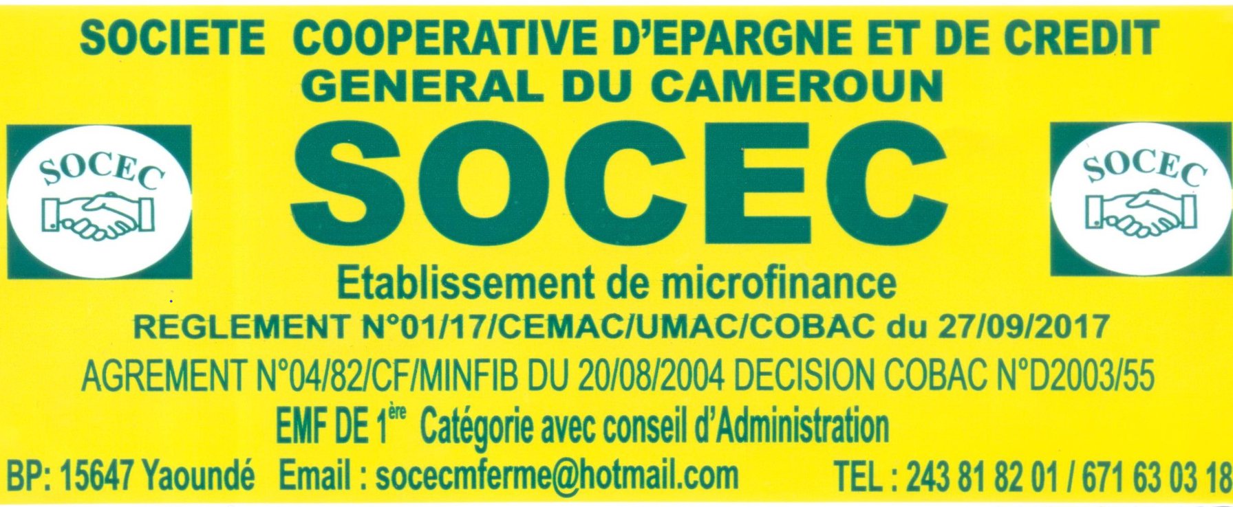 La Société Coopérative d'Épargne et de Crédit Général du Cameroun (SOCEC) est un établissement de micro finance créée officiellement au début de l'année 1999, le 17 février à Bafoussam. La SOCEC a pour devise Travail – Persévérance - Fortune. Elle est représentée dans trois (03) grandes villes du Cameroun : Bafoussam, Douala et Yaoundé avec deux (02) agences : Melen et Essos. La SOCEC est une micro finance principalement spécialisée dans l’épargne et l’octroi de crédits. Elle assure également : Le transfert national et international, les découverts à court et moyen terme, la réduction des effets, le paiement des employés d'entreprises publiques et privées, la gestion du patrimoine.