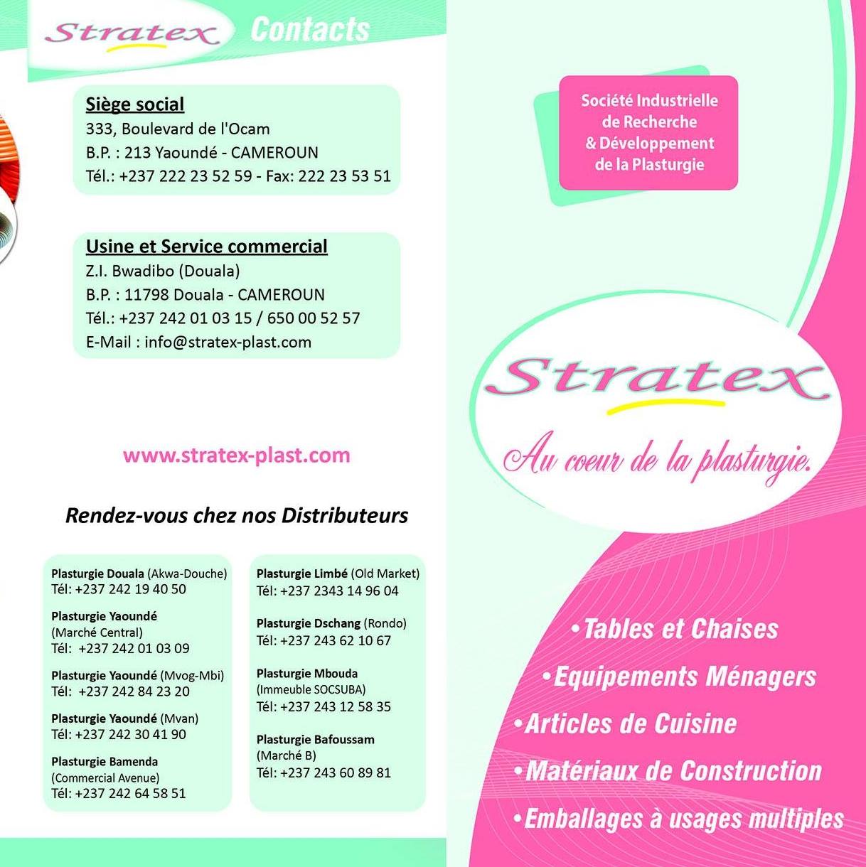 STRATEX (Société Industrielle de Recherche et Développement de la Plasturgie) est une entreprise manufacturière spécialisée dans la fabrication de produits en plastique par des procédés d’injection, d’extrusion et de soufflage. STRATEX offre une gamme complète de matériaux de construction, des articles pour usage domestique des emballages, sachets et bidons. Elle fait aussi dans la sous-traitance industrielle en fabriquant des produits en plastique utilisés dans le secteur de l’agroalimentaire, l’agriculture. En plus de ça elle propose des supports de communication personnalisés en plastique dédiés aux entreprises. Fondée en 2004 et filiale d’un groupe à capitaux nationaux, STRATEX fabrique et commercialise plus de 800 produits et emploi près de 250 personnes en main-d’oeuvre directe dans son usine située à Douala (Bwadibo).