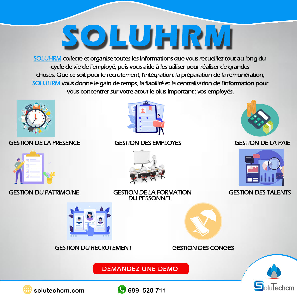 SOLUTECHCM est une entreprise camerounaise proposant des biens et services informatiques à la pointe de la technologie moderne. Elle est spécialisée dans l’intégration et la mise en place des solutions PGI/ERP, GED, le E-management, le consulting, les web services, la formation du personnel d’entreprises. SOLUTECHCM propose aussi l’étude, la fourniture et l'installation des Solutions IT et ce, tout en assurant le suivi, les conseils et le service après-vente. SOLUTECHCM est basé à Yaoundé au quartier Simbock.