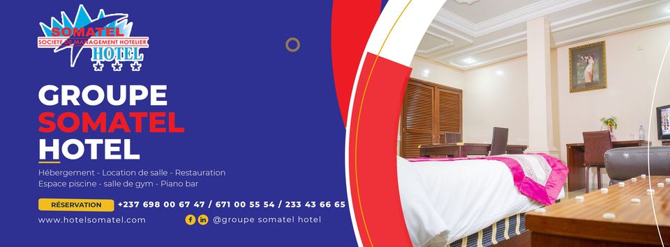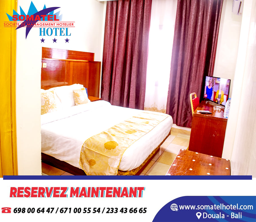 Après Yaoundé en 1999, le Groupe Somatel déporte son charme dans la cite capitale économique camerounaise et vous offre Somatel Hôtel Douala – Bali. Admirablement situe au cœur de Douala, sur le boulevard de la république au quartier Bali, Somatel Hôtel stratégiquement est à 5 minutes des quartiers administratifs et résidentiel Bonanjo et Bonapriso ainsi que de l’aéroport international de Douala. Classé 3***, Somatel Hôtel vous offre confort, bien être et sécurité pendant votre séjour. Bâti à quelques kilomètres du centre des affaires Akwa. Somatel Hôtel c’est un accueil des plus chaleureux dans un cadre facile d’accès et serein; un personnel riche de qualités professionnelles et soucieux de votre félicite; un hébergement de prestige reposant sur 86 chambres haut standing de quatre catégories (appartement de luxe, standard junior, annexe) équipées de TV, climatisation, Internet, divan, mini bar, salle d’eau avec baignoire, placard …, pour un séjour agréable. Somatel Hôtel c’est aussi une restauration originale , attractive et variée assurée des mains d’œuvre par une équipe aux vertus culinaires hallucinantes ; des salles de réunion douillettes et lumineuses d’une capacité d’accueil de 15 à 150 places à la stricte mesure de vos attentes ; sa terrasse ouverte sur le boulevard mais surtout un bon rapport qualité prix. Somatel Hôtel vous offre tous les services d’un grand hôtel et vous fait bénéficier d’un service d’accueil personnalise garanti par sa navette qui, à votre arrivée vous prend à l’aéroport et vous y dépose à votre retour. Le séjour à Somatel Hôtel est un véritable moment d’hilarité et d’euphorie, le tout dans une commodité extatique au décor fastueux et subtil.