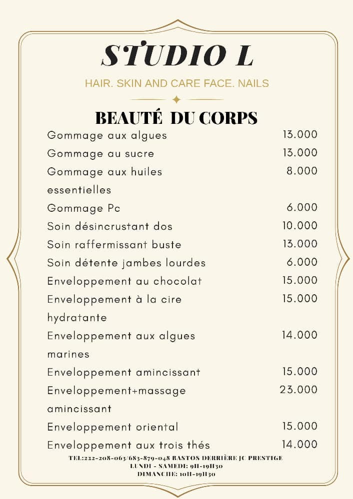 Situé derrière l’hôtel JC Prestige bastos, Studio L est un Institut de beauté qui répond à tous les besoins de la population de Yaoundé, en termes de soins et beauté des cheveux et du corps. Qu’il s’agisse d’un tissage, une coiffure, une manucure, un soin de visage, ou un Make Up, l’Institut de beauté s’attèle à offrir à sa clientèle les meilleurs services possibles. De plus, Studio L, dans l’optique de satisfaire sa clientèle et de leur offrir le meilleur, met un point d’honneur sur la qualité des produits utilisés pour les soins et les coiffures. Vous y retrouver des produits de renommée internationale, et des marques qui vous garantissent des résultats exceptionnels et satisfaisants.