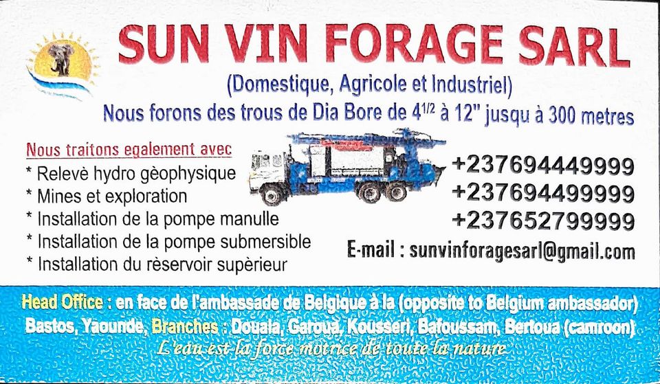 Sun Vin Forage Sarl est la société multidisciplinaire fourragère la plus fiable et la plus importante située au Cameroun. Nous opérons également au Mozambique, en Zambie, au Zimbabwe, au Nigéria, en République Centrafricaine et en Inde. Avec plus de 20 ans d'expérience dans l'industrie fourragère, la société offre les meilleures solutions pour tout type d'eau nécessaire. Fondée en 2010, Sun Vin Forage Sarl est une société de forage basée en Afrique avec une flotte de 20 appareils de forage qui fournit des services de forage d'exploration et de développement aux sociétés minières majeures, intermédiaires et juniors avec des activités d'exploration, de développement et de production.