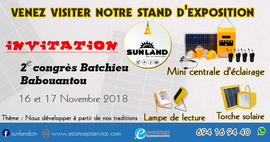 Porté par un groupe de jeunes Camerounais, Sunland Energy propose des solutions d'accès à une énergie propre et durable dans les zones rurales des pays d'Afrique Centrale. Nous mettons à la disposition des ménages des Kits solaires fournissant de l'électricité à moindre coût. Grâce à nos solutions de micro-credit, nous permettons à la population de payer les équipements sur une longue période. Sunland est un produit de la société d'ingénierie E-concept.