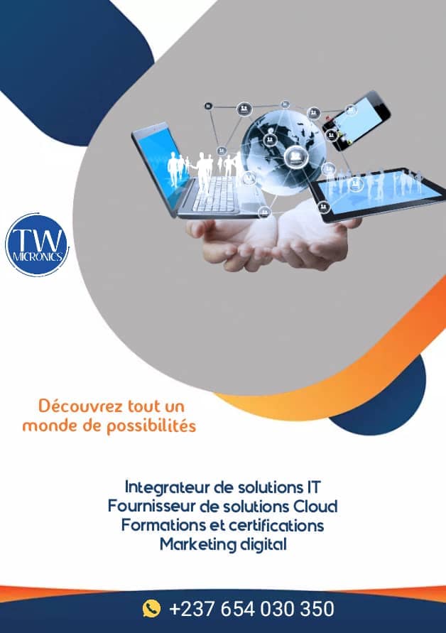 TW MICRONICS est une entreprise de services informatiques implantée en Afrique Central, qui vous accompagne dans la Transformation Digitale de votre entreprise et le déploiement d'une stratégie Cloud pertinente. TW Micronics c'est également un centre de formation technique et nos experts formateurs certifiés, sont là pour assurer la montée en compétence de vos équipes. NOTRE EXPERTISE: - Cloud et intelligence Artificielle, - Développement Web et mobile, - Progiciel de gestion intégrée (ERP), - Sécurité des données, - Productivité et collaboration, - GED et Workflows, - Stratégie Digitale - Archivages - Référencement Web. Nous avons pour partenaires: Microsoft, Odoo, Autodesk, Pearson vue, Certiport ou encore Prometric. TW Micronics est basée à Yaoundé, au quartier Omnisport avec une agence à Douala au quartier Bonamoussadi.
