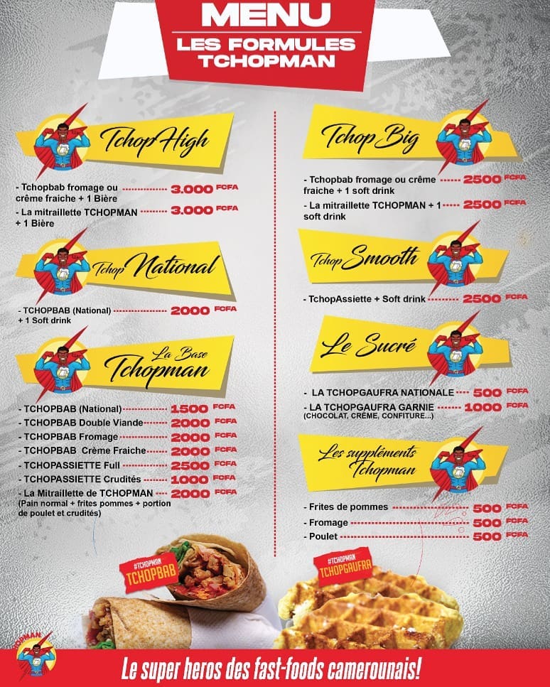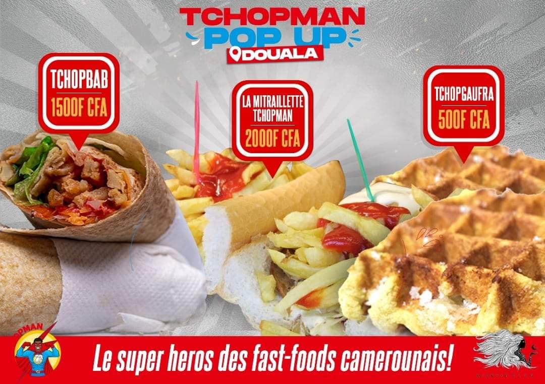 Tchopman est un street fast food basé à Yaoundé. Nos produits sont pour la plupart préparés à base de viande blanche, de légumes frais et de sauce à bases d'épices locales. A 80% diète et donc bon pour la consommation sans risque d'obésité. Nos produits, l'hygiène, le service sont à la hauteur du héros Tchopman. Le goût au cœur de nos préparations.