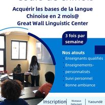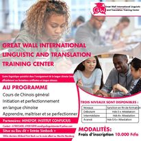 The Great Wall International Linguistic and Translation Training Center est un centre linguistique international spécialisé dans l’enseignement et l’apprentissage de la langue et de la culture chinoise et la traduction chinois, français, anglais. Nous vous proposons une méthode d’apprentissage originale et innovante qui accélère l’acquisition de la langue chinoise grâce à de multiples formules pour apprendre le Chinois : cours de Chinois individuels collectifs, cours de Chinois professionnels et des stages de Chinois combinés, cours de Chinois pour hommes et femmes d’affaires (Business Chinese), cours de Chinois pour les fonctionnaires et diplomates, préparation au Hsk, Test de maniement du Chinois (tous les niveaux).Une palette d’outils de suivi est mise à votre disposition à tout moment pour mesurer la formation quantitativement et qualitativement: suivi des formations, tableau d’assiduité, solde d’heures. Nos formations sont éligibles aux dispositifs de la formation professionnelle et certifiante et nos enseignants camerounais et chinois sélectionnés sur la base de leurs compétences pédagogiques et techniques avérées.
