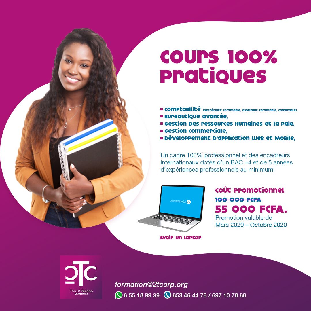 La Thrust Techno Corporation (2TCorp) est une société dont les activités gravitent autour de la formation de personnes sur des applications métiers, les prestations de services informatiques et le développement d'applications à but commercial. Fondée en 2018 par 2 jeunes entrepreneurs camerounais, la thrust techno Corporation (2TCorp) voit le jour à travers ses idées innovatrices toutes destinées à valoriser l'émergence du Cameroun. Nous avons démarré cette énorme entreprise munie juste de nos idées et de nos PC. Ses 2 co-fondateurs accueillent aujourd'hui régulièrement plusieurs stagiaires chaque année.
