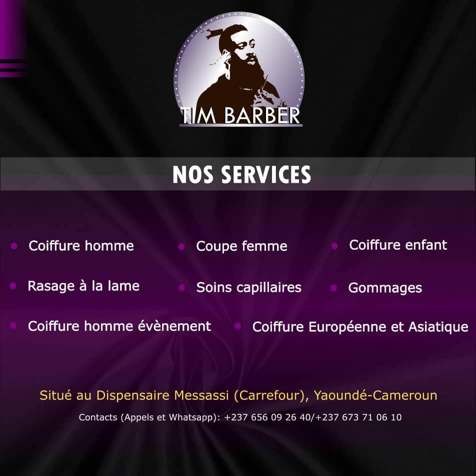 Tim Barber est un salon de coiffure situé à Yaoundé au lieu-dit Dispensaire Messassi. Dans un cadre agréable et avec un personnel professionnel pour votre beauté, Tim Barber vous propose : des coiffures homme, femme et enfant, du rasage, des soins capillaires et des gommages.