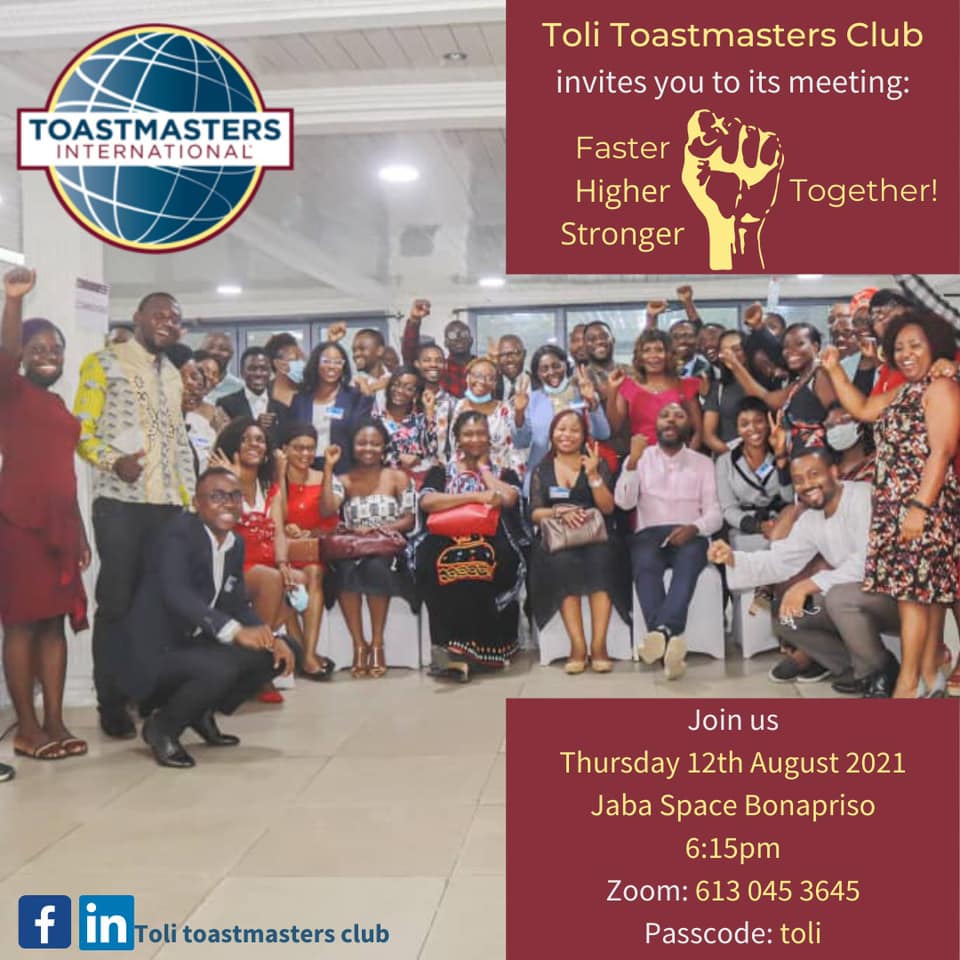 Toli Toastmasters Club est un club qui crée de meilleurs auditeurs et des membres d’équipe et des leaders plus forts, capables de donner et de recevoir des évaluations constructives. Il forme une communauté de personne grandissant de jour en jour capable de booster le leadership dans la société et l'esprit d'initiative. il organise plusieurs événements au cours de l'année qui se déroule à Douala dans une des salles de l'hotel Princes de Galles de Akwa.