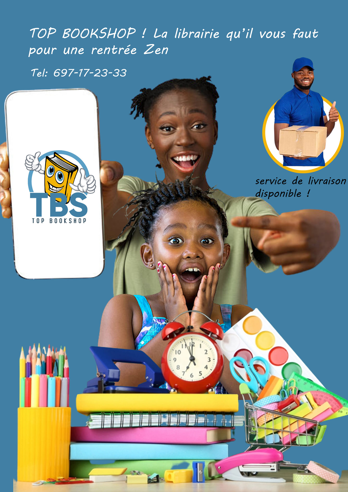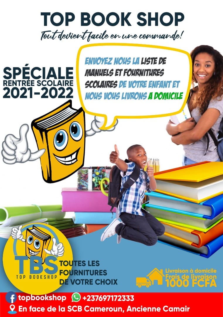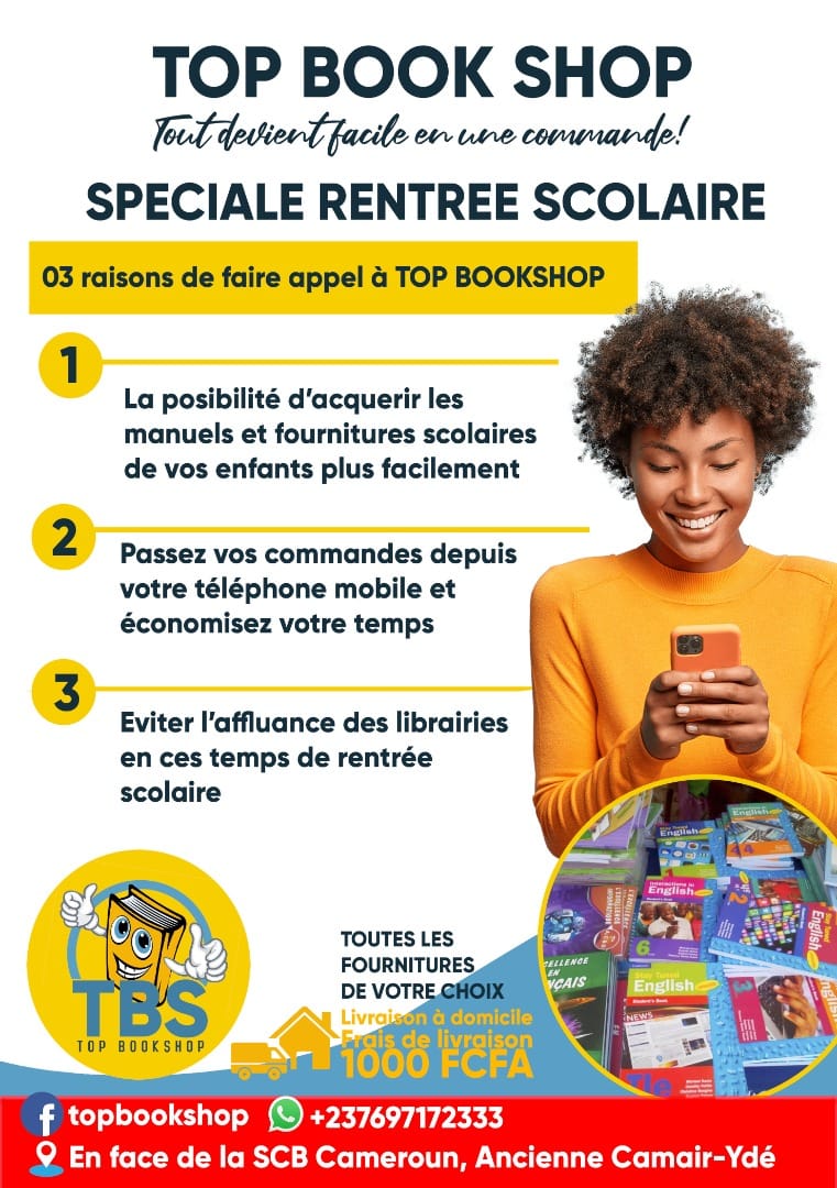 La rentrée scolaire approche et vos enfants n'ont encore ni fournitures ni manuels ? Vous êtes surchargé entre le boulot et les courses ? Ce n'est pas un problème car nous avons la solution qu'il vous faut en deux mots : Top Bookshop. Nous sommes une librairie située en face de la SCB, anciennement Camair Yaoundé, qui vous offre la possibilité de commander les manuels et fournitures scolaires de vos enfants (Maternelle, primaire, section anglophone et francophone) via votre portable ou votre PC et de vous faire livrer à domicile ou au bureau et de payer uniquement lors de la livraison. Si vous aussi ne supportez pas les longues files d'attente, les librairies bondées, le temps perdu à chercher un livre alors vous ne serez pas déçu car nous nous ferons le plaisir de tout prendre en charge.