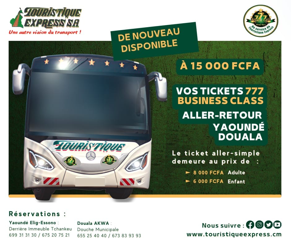 Touristique Express SA est une entreprise de transport inter urbain de personnes et biens. Elle s'est imposée jusqu'à nos jours, et ce, depuis 1999, date de sa création par Monsieur Yaouba Bello, comme un pilier dans le secteur du transport interurbain. Depuis lors, Touristique Express propose trois services essentiels à la clientèle : le 111 classique, le 444 confort et enfin le 777 Business Class qui est le service VIP. A nos jours, Touristique Express SA marque sa présence dans 7 régions du Cameroun à savoir le Littoral, le Centre, l'Est, l'Adamaoua, le Nord, l'Extrême nord, et bientôt le Sud).Dans sa quête incessante de croissance, Touristique Express SA entend dans un horizon à moyen terme, couvrir l'étendue du territoire Camerounais en matière de régions.