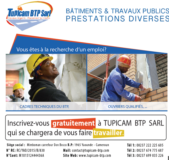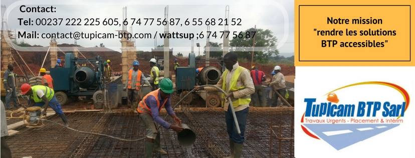 Tupicam BTP Sarl est une agence de recrutement et de placement du personnel exerçant dans le domaine des travaux publics et batiments. Installée à Yaoundé où elle détient un espace bien amenagé au quartier mimboman pour la formation du personnel en vu de leur emploi dans differents projets, la société élabore des plans et construits des édifices avec des matériaux adéquats.