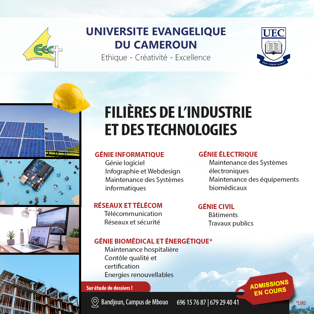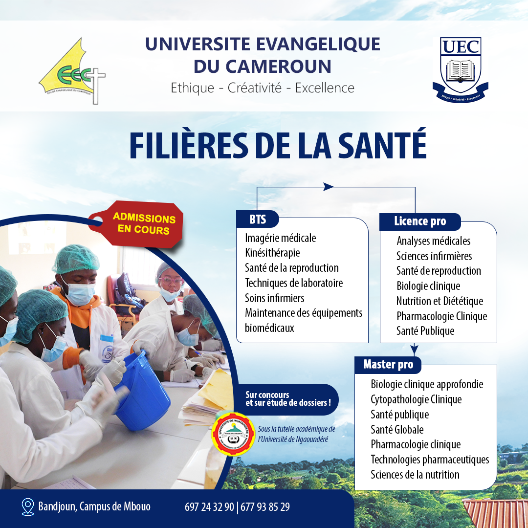 L’Université Evangélique du Cameroun (UEC) est une institution d’enseignement supérieur fondée par l’Eglise Evangélique du Cameroun. Autorisée par la lettre ministériel N° 10/00088/N/MINESUP/DDES/ESUP/SAC/emb du 29 mars 2010, et régularisée par les arrêtés ministériels de création N° 11/0536/MINESUP/SG/DDES du 05 octobre 2011 et d’ouverture N° 12/0399/MINESUP du 17 Aout 2012, l’UEC est située dans la Région de l’Ouest-Cameroun. L’Université Evangélique du Cameroun a été créée sur les fondements de l’Institut Pédagogique pour Sociétés en Mutation (IPSOM), une institution supérieure de formation des enseignants et des enseignantes, mis en place à Mbouo/Bandjoun par l’Eglise Evangélique du Cameroun.