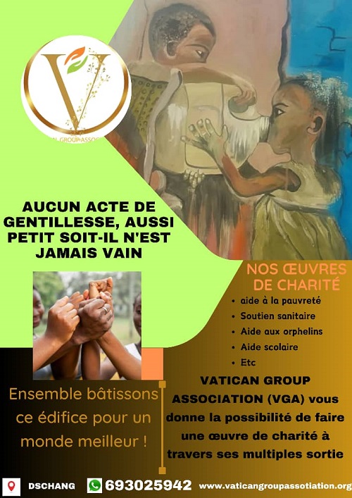 Vatican Group Association (VGA) est une organisation humaniste, apolitique, laïque et à but non lucratif dont le but est d'agir en toutes circonstances et en tous lieux en faveur des personnes socialement vulnérables. Vatican Group Association se concentre sur les questions de pauvreté, de santé, d'éducation, d'eau et d'action sociale dans les zones rurales du Cameroun, d'Afrique et d'autres pays. VGA fournit une assistance morale, éducative, sanitaire, financière et matérielle aux personnes dans le besoin et/ou en souffrance.