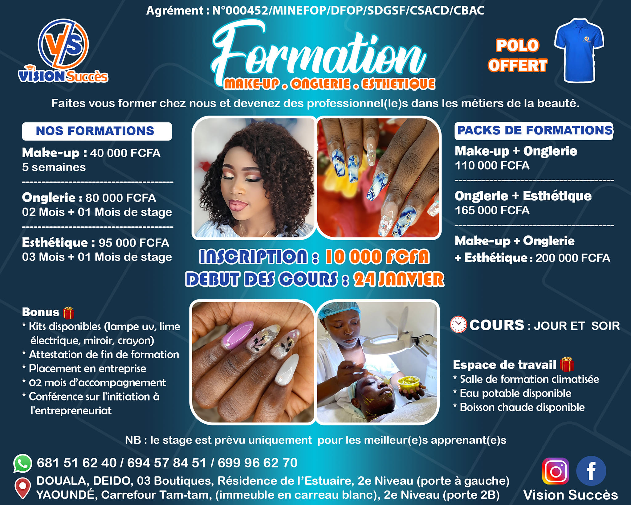 Vision Succès est un centre de formation professionnelle agréer par le ministère de l’emploi et de la formation professionnelle basé à Douala et à Yaoundé. Vision Succès offre des formations dans le domaine du Make-up, de l’onglerie, l’esthétique, la coiffure et la pâtisserie.