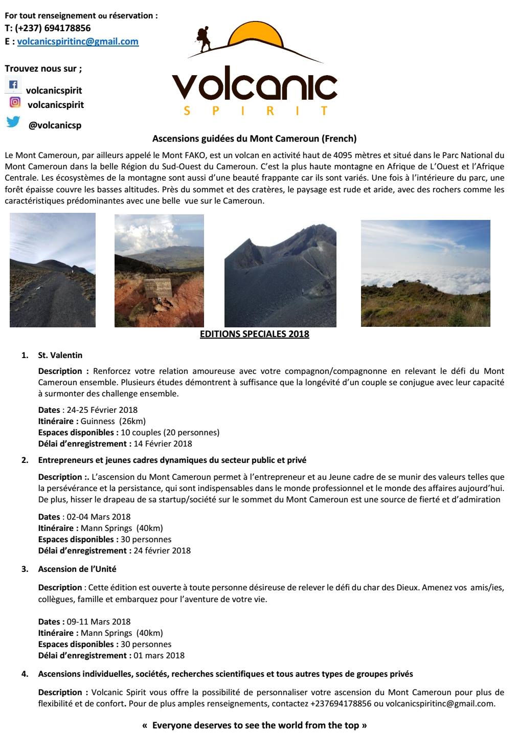 Volcanic Spirit est une startup touristique qui s'efforce de promouvoir l'écotourisme au Cameroun. Actuellement, nous proposons des visites guidées professionnelles sur le mont Cameroun, la plus haute montagne d'Afrique de l'Ouest et abritant les plus récents cratères volcaniques du monde.