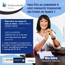 Waderschool Cameroun est une extension du groupe français Waderschool International, qui s’occupe de la mobilité des élèves et étudiants étrangers pour la France. Waderschool vous propose 03 écoles de métiers en France : ASTON- DIDEROT CAMPUS et ISTELI.