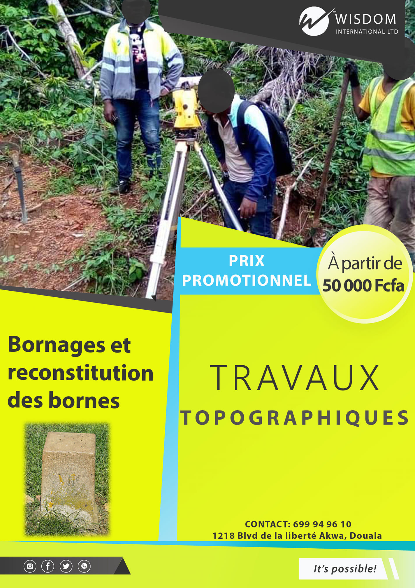 Wisdom International Ltd est une entreprise citoyenne qui porte une vision d’accompagnement, des organisations, des individus déterminés à la découverte de leurs potentiels. Elle est aussi un incubateur de solutions clés dans divers domaines tels que : la formation, le coaching, le BTP, la logistique et le transport, l’immobilier, la vidéosurveillance, le marketing, la communication, le conseil juridique et fiscal.