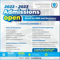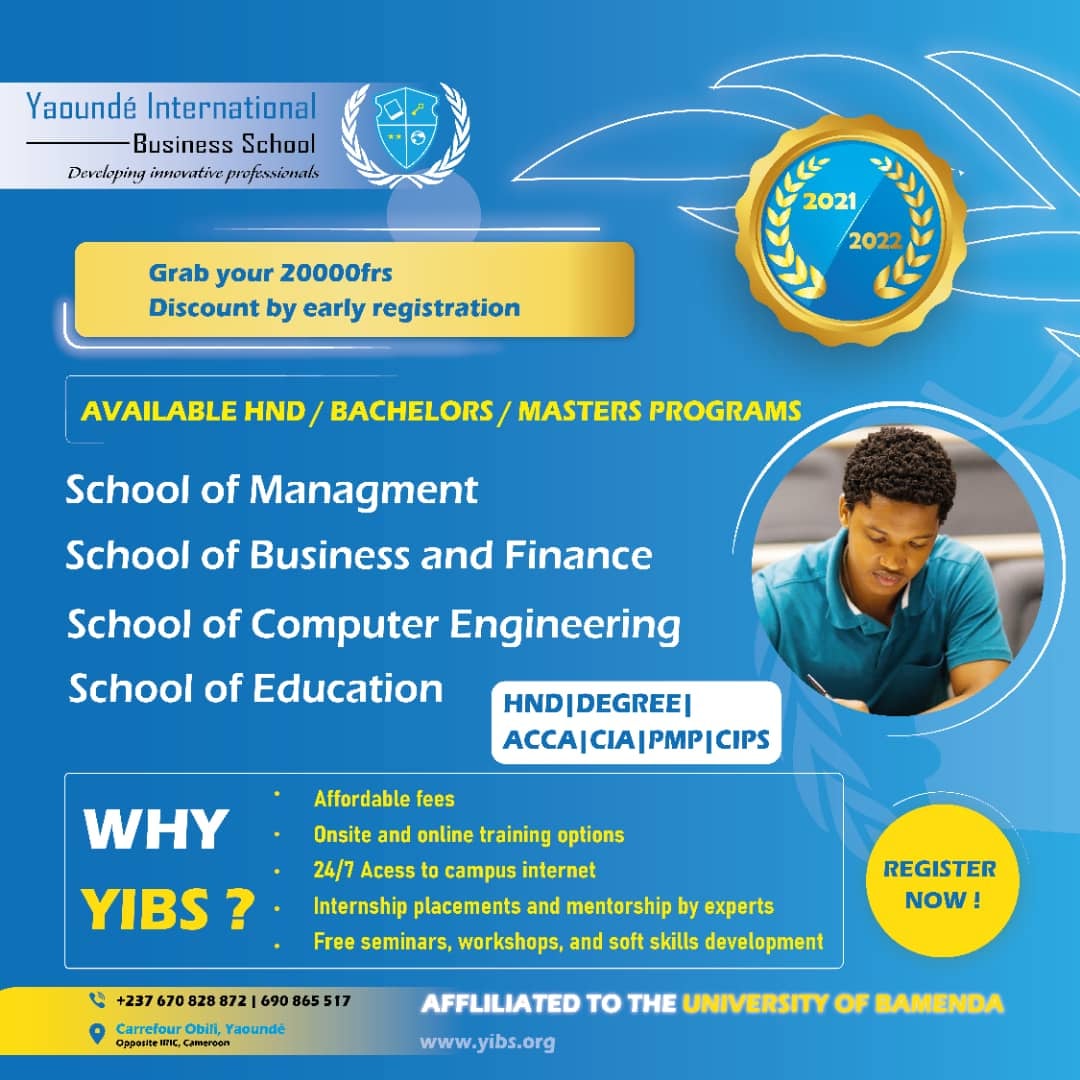 Yaoundé International Business School (YIBS) propose des programmes de développement de carrière axés sur l'industrie et conçus pour répondre aux nouvelles tendances du marché des économies émergentes. Notre objectif est d'ancrer chez les étudiants un objectif de carrière et une vision pour un impact durable sur leur vie et les communautés dans lesquelles ils opèrent. Notre personnel d'enseignement est issu d'un réseau de dirigeants d'entreprises réputés dans des entreprises de premier plan, qui ont acquis des qualifications similaires et qui s'appuient actuellement sur le terrain. Nous sommes uniques dans notre prestation et ne discriminons sur aucune base, étant donné la possibilité de transformer les individus en experts commerciaux proactifs grâce aux différents programmes de scolarité. Ainsi, YIBS offre des opportunités d'avancement de carrière à tous les niveaux et dans diverses disciplines liées aux affaires, niveaux d'entrée allant du niveau ordinaire GCE au Master. La Yaoundé International Business School dispose de campus à Yaoundé (Obili - face IRIC, et Carrefour Simbock).