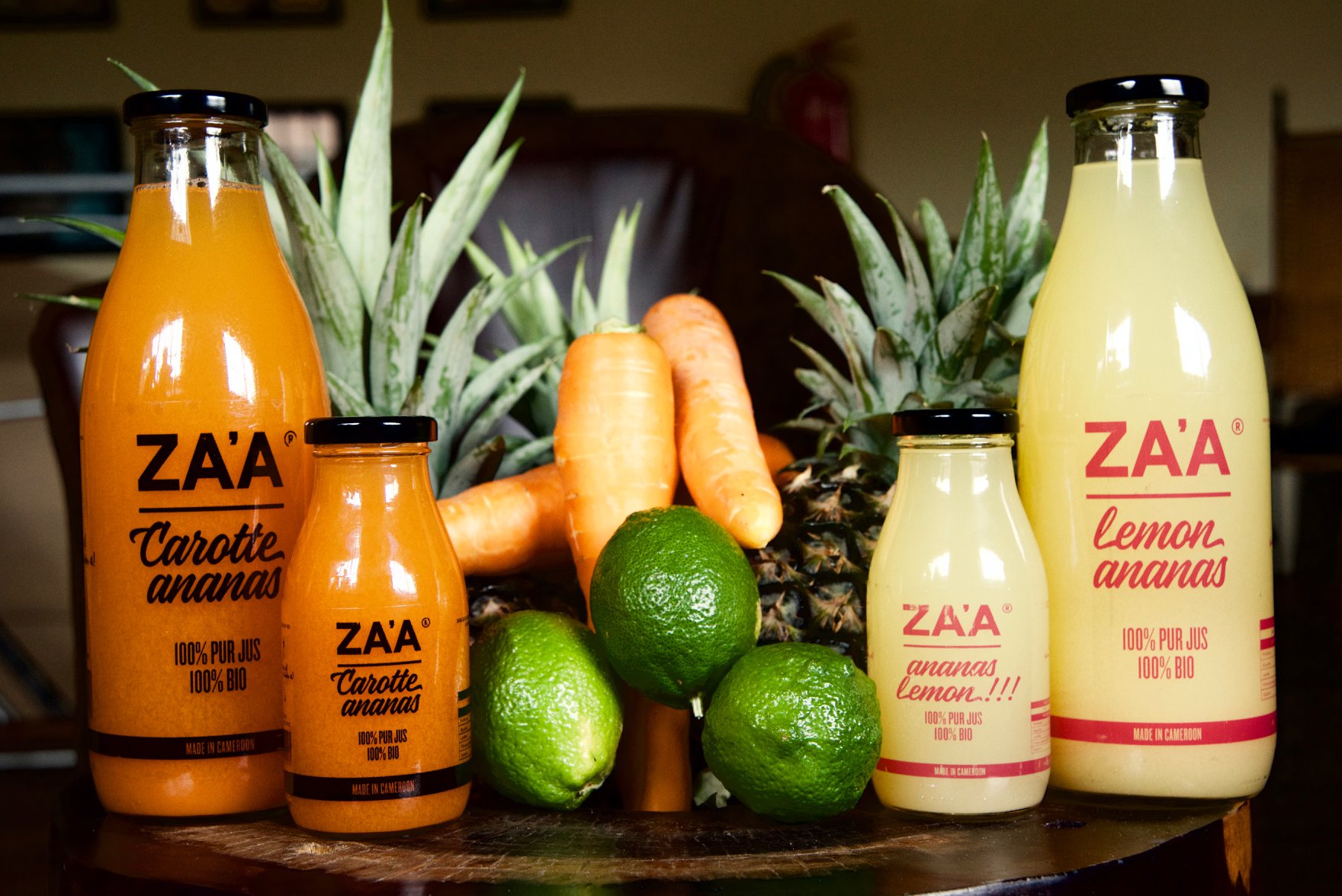 ZAA’ est une marque de jus fruits, naturels, Bio, 100% pur jus fabriqué au Cameroun. Pour produire vos jus de fruits ZAA’, notre système de traçabilité vous donne l assurance d'un produit de qualité et d'un suivi rigoureux. En effet nous savons pour chaque production de quelle parcelle de notre exploitation viennent les ananas et fruits de la passion. Nous produisons les jus ZAA’ avec amour et savoir faire.