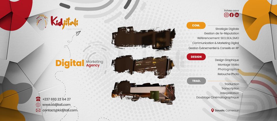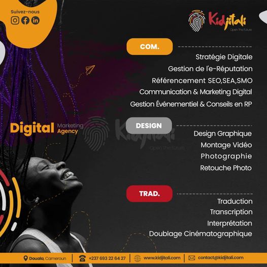 Kidjitali est une agence spécialisée en communication et marketing digital. Tirant son inspiration au cœur de la culture africaine, elle œuvre à la digitalisation des entreprises et organisations et propose à cet effet une expertise poussée dans les prestations suivantes : communication digitale, marketing digital, promotion digital, stratégie digitale, référencement SEO, SEA, SMO, marketing d'influence, design graphique, traductions et transcriptions, gestion événementiel et projet d'arts. Kidjitali... Open the futur.